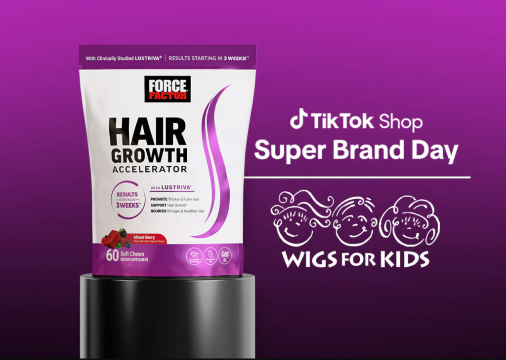 Force Factor recently partnered with Wigs For Kids for an incredible TikTok Super Brand Day, combining fun, awareness, and generosity to make a real impact. The event featured Force Factor’s popular Hair Growth Accelerator Soft Chews, and for every purchase made during the live stream, 20% of sales were donated to Wigs For Kids!