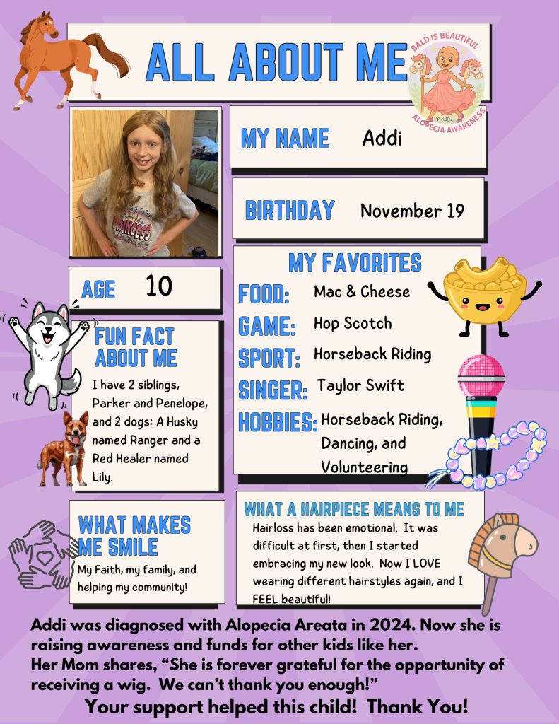 Now, her work with Wigs For Kids has opened the door to learning even more about hair loss. After helping Addi, Emily is already preparing to assist the next child in her area, offering renewed confidence and self-esteem through compassionate support and skilled service. We are honored to have her as part of our mission to help incredible kids feel like themselves again.