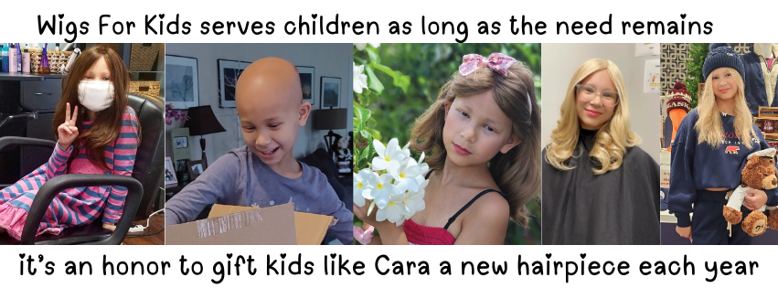Please consider adding a small financial donation to help Wigs For Kids with the cost of hair processing, services, and hair replacements (which average $2600 yearly per child). Any amount helps us get closer to helping another child.